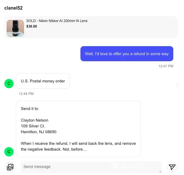 Clayton Nelson tried to extort me on Ebay. He purchased a Nikon 200mm lens that he's Facebook posts would suggest he was delighted with- however he left me negative ebay feedback, demanding I send him a USPS Money Order before he'd remove the negative feedback. Ebay views this as extortion and removed said negative feedback, however I can attest that Clayton is a COMPULSIVE LIAR, who is extremely hostile and unprofessional. This lonely person is a shadow of a man and should NOT be trusted.