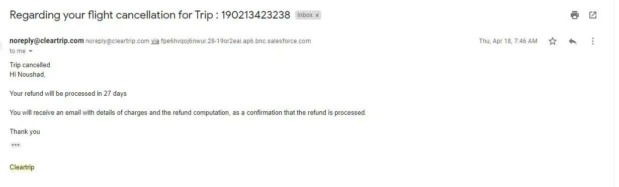I book my ticket in in last week of April as my flight was on 12th of May but because of govt restriction I couldn't fly and have to cancel on 11th of May and they Cleartrip Guy told me that Trip ID [protected]. Refund will take 25 to 30 days for refund processing now its been over a month and they are not reply my email and not give any response regarding that matter so kindly look into it and help me in this matter