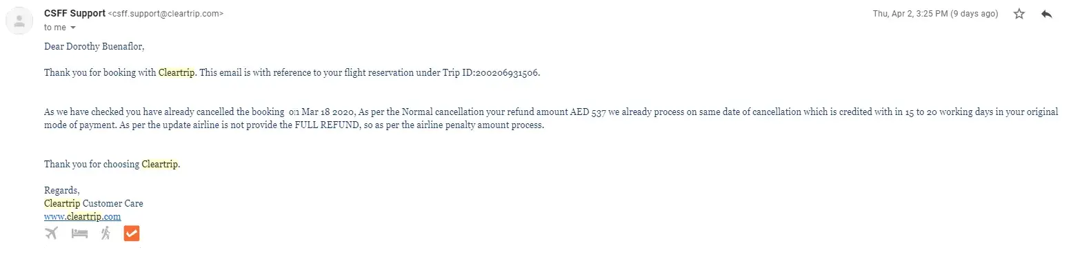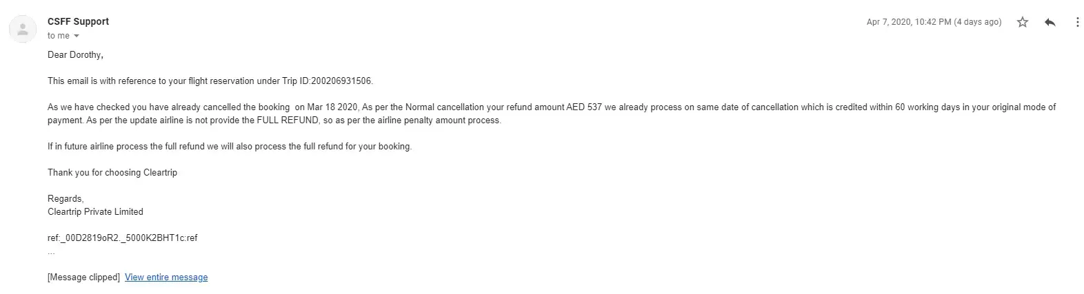 March 15, I requested a cancellation base on the agent's information that it will be processed with a full refund. Upon checking (Trip ID [protected]) 537 AED was only reversed from 4, 851.61 AED spent. This is unacceptable, if I knew then I wouldn't cancel a flight dated Apr 22 as it is too early. I sent several emails with them requesting to convert it to the travel voucher or refund but they are sending the same emails without investigating. Emirates have convert to the voucher option. But since it was booked via the agent, the airlines couldn't process the travel voucher. I understand that Emirates did not refund my ticket but it was clear that my request was to cancel it if it will be a full refund and the agent assured me that it was a full refund. This is clearly a mistake in Cleartrip side. Please help me.