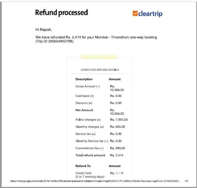 I had booked a flight ticket from Cleartrip on June 5th, 2020. Ticket has confirmed for 11th June and that was for an Indigo flight. After 2 days i received an email from Indigo stated that the booked flight had been cancelled due to COVID-19 situation. After received this cancellation confirmation from Indigo, i have cancelled my booked tickets. During the cancellation of ticket, Cleartrip has mentioned that full refund will be provided as this is cancelled from Airline end. After few days i received an email from Cleartrip regarding the refund amount. I paid an amount of RS 10594 but they refunded only RS 2414. I don't understand the reason for the deduction of remaining amount. Flight had cancelled from Airline end and we did not travel. How they can justify the deduction of RS 8180. I need a full refund amount as this is not a mistake from our end. Kindly intervene and do the needful asap.