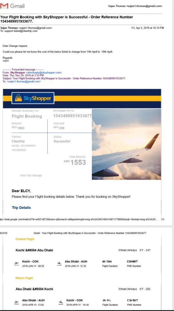 I had a booking in with the ref id [protected], it is a round trip from kochi abudhabi and the partly used. Return ticket date is supposed to be 11th April2019.