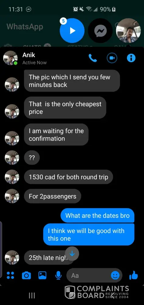 2nd a day before my flight as i was not aware about the cancelattion he msged me that their is a delay in flight for 48 hours and i told him that i am looking to leave to india from canada early as i dont even have vacation for not even a month, please look for wht best can be done. He came put with a solution and he booked a ticket a bit early on date and i again transfered him the money as he told me tht previous one will be refunded in a 10 days and also as its more the 48 hours of delay the airlines will refund 100$ per ticket.