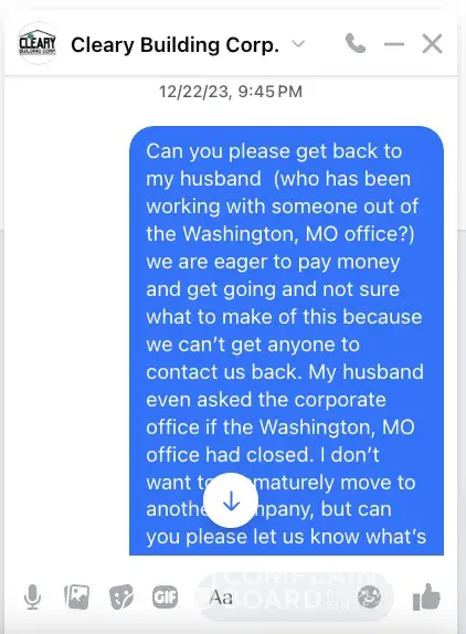 Cleary Building Corp has been in business for over 40 years and sold over 111, 000 buildings. We have never proclaimed that we are perfect and in construction this is sometimes an impossible task. What we do recognize is that we do fall down but always we work to correct the problem in a diligent and expeditious manner. We have branches throughout the United States and we have our corporate office in Verona, WI that monitors customer service throughout country. Our contract document is upfront about the next steps of the project and what happens if a party does not want to proceed. We make every effort possible to correct a situation and follow through with a contract, including in this case. Cleary Building Corp is a custom builder and every project is a unique design for us. This person does not want to proceed now but 6 months ago they said they may come back for a different building. We offered them a credit for the next building when they return. Thank you, Mike Wuennemann, Director of Marketing