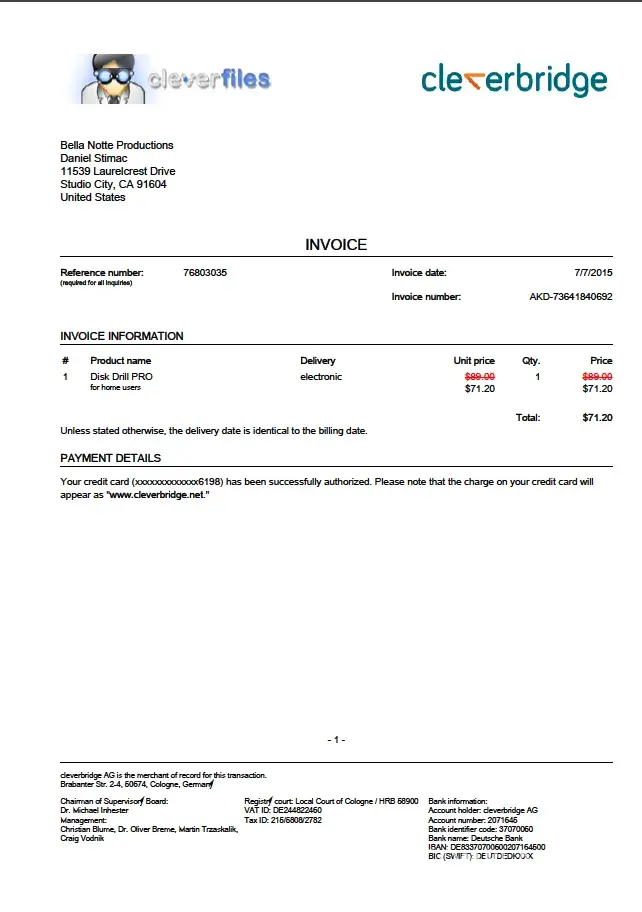 I bought Disk Drill from CleverBridge.net. At the time of the transaction, they did not disclose that there would be any foreign transaction fee. They gave the total of $71.20. When this charge appeared on my credit card statement, there was also a foreign transaction fee charge of $2.14 which has the same company/reference number as my software purchase. If they're going to charge a foreign transaction fee, they need to make it known! If I agree to pay a total of $71.20, than $71.20 should be my total! I want them to waive this transaction fee.