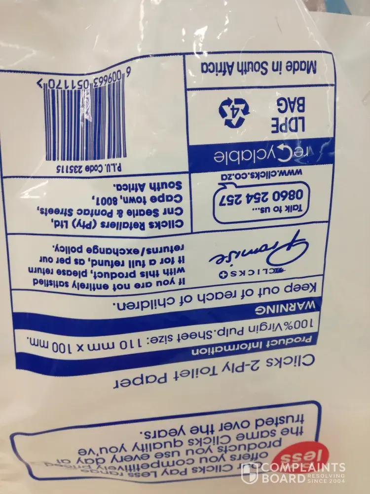 I recently purchased a packet of 18 2 ply toilet rolls from Clicks at Blue Route Mall. The toilet rolls were not up to standard and the rolls were off such weak quality that even some 1 ply would be better than the toilet rolls purchased. Very dissapointed with the brand and quality.