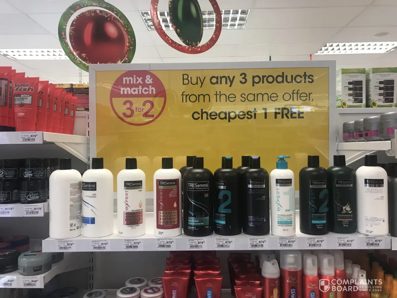 On the 18 November 2018 I was at Clicks Mountain Mill in Worcester. I bought Tresemme Sjampoo's and Conditioners. On the shelf it shows a promotion: