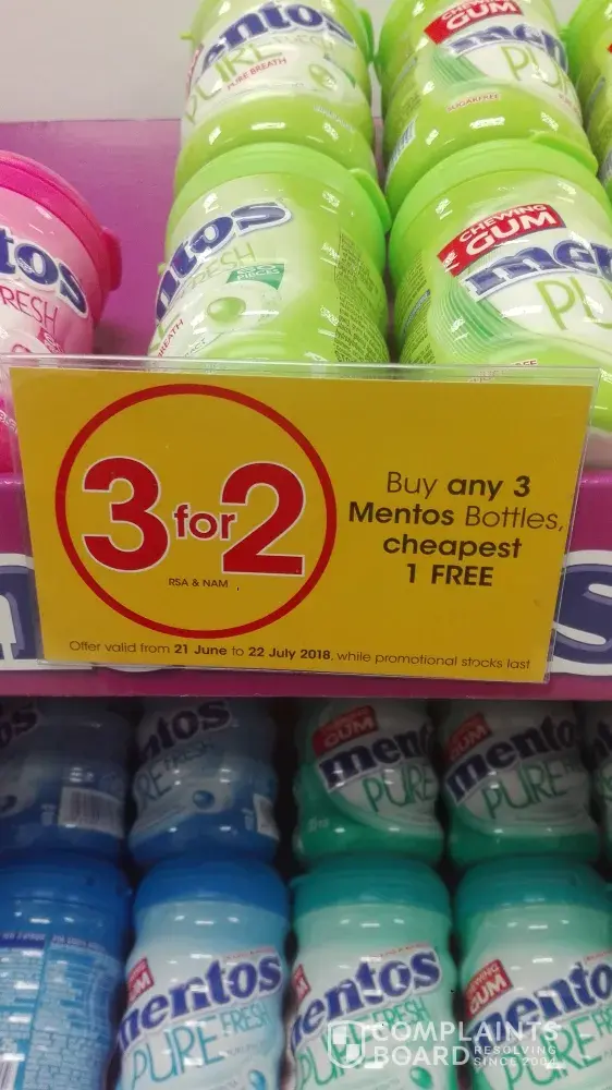 So there was another male cashier next to the one that was cashing up my items that told her that the mentos bubblegum was infact 3 for 2 thandiwe then told me that it wasn't the variant that I picked, she said that specific one did not have a "ticket" for the special