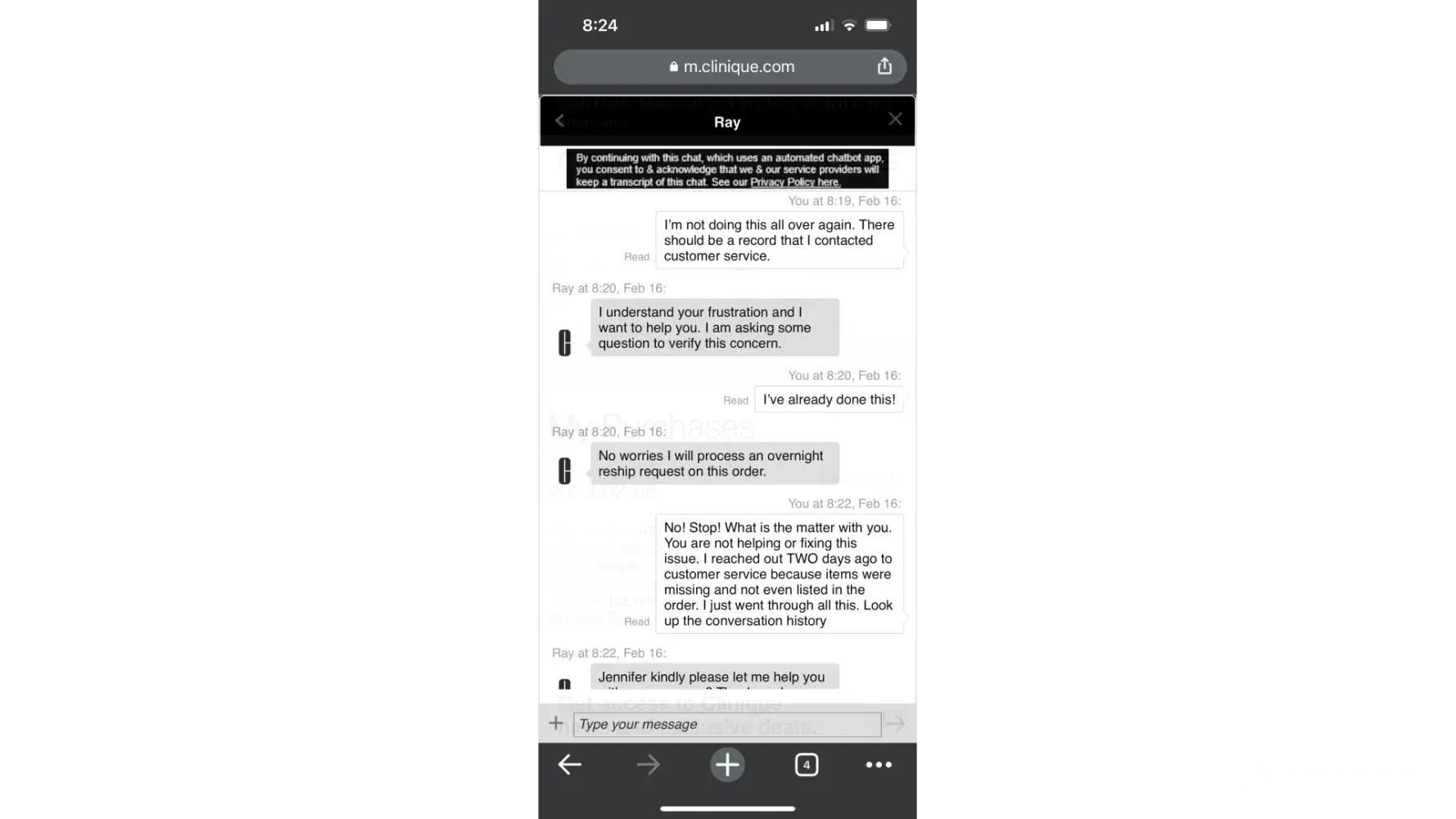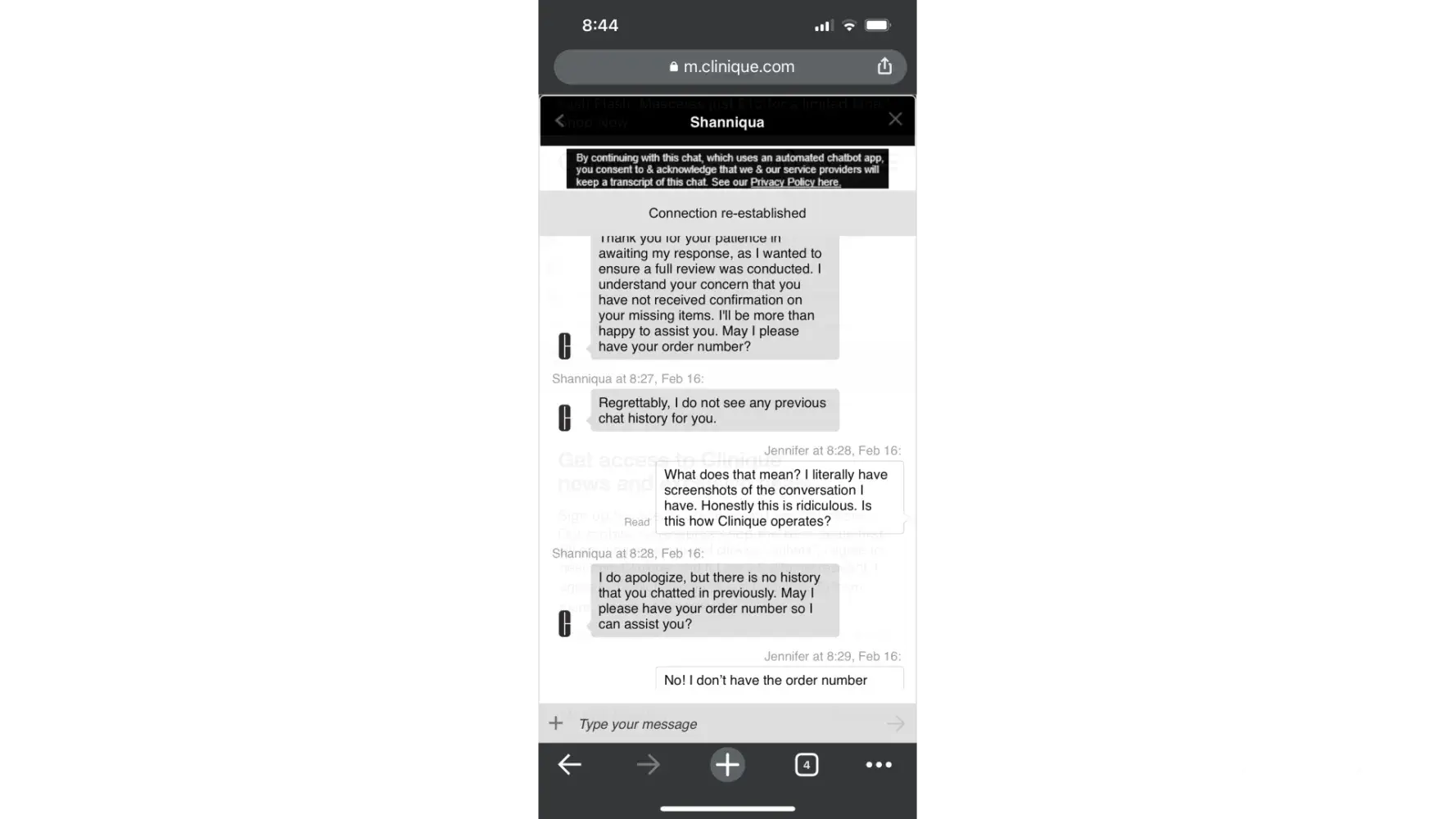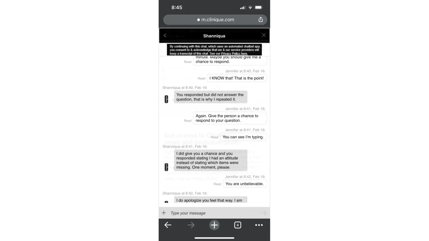 On Feb. 21 I received the missing items only to find that the promo kit was not correct and, not only that, it’s one I cannot use half the product of. It contains several perfume items, which I’m allergic to, as well as lipstick that I cannot use. I reached out to customer service chat again, and was connected with Shanniqua again, who does not seem to remotely care about my very poor experience with Clinique. After another lengthy chat Shanniqua finally decided to explain that if an order does not qualify for a product it will show on the order but once you submit it, Clinique will delete it from the order. This is false advertising and a completely unethical practice. I cannot believe they have been getting away with processing orders in this manner. Shanniqua specifically is not equipped or capable of being a supervisor. All her responses were unhelpful and did not acknowledge or resolve the issue. In addition, they completely lack a customer service mindset and displays a negative, disagreeable outlook through the entire conversation that only exacerbates the issue.