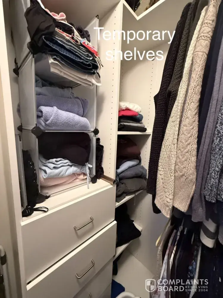 I paid Closets by Design $3,250 for a custom closet system in August 2025. As of today (April 2026), my closet is still incomplete and unusable.