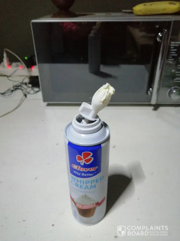 On 3rd July I bought clover whipped cream with new nozzle, I have no issue with product itself however the nozzle breaks and cream pushes out from under new nozzle not up and out so one has to break off the nozzle completely while cream just keeps bubbling out.
