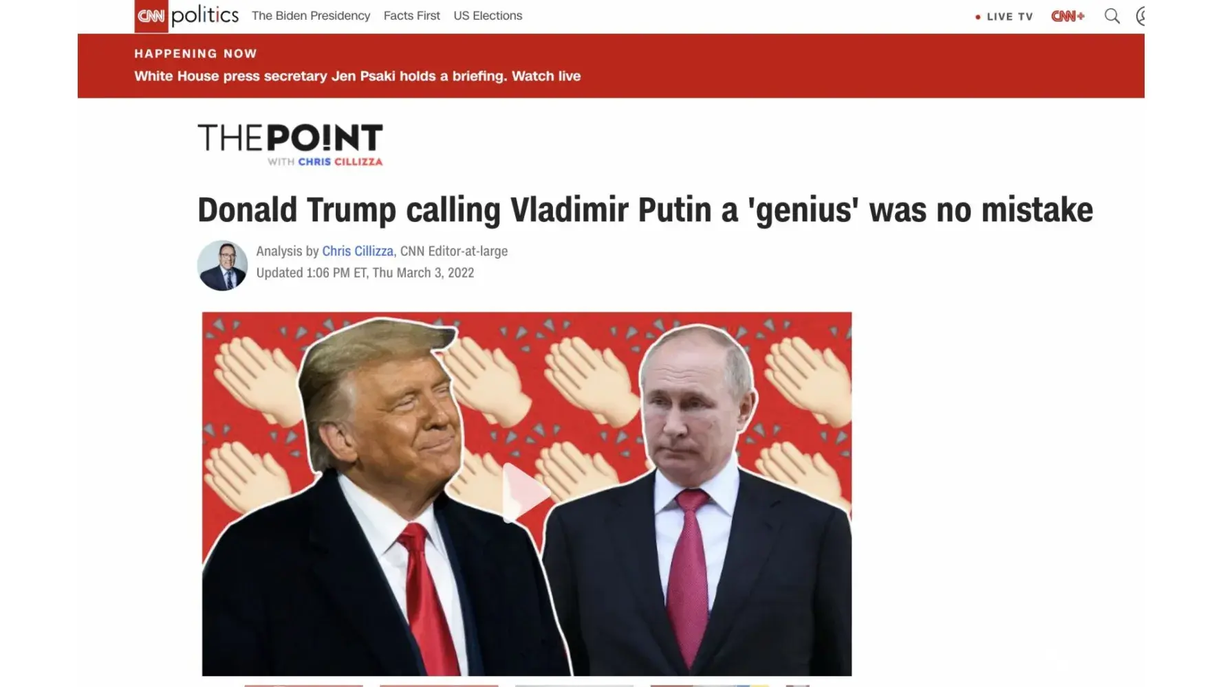 This article is trying to frame Donald Trump to like Putin and think his illegal war crimes is good.