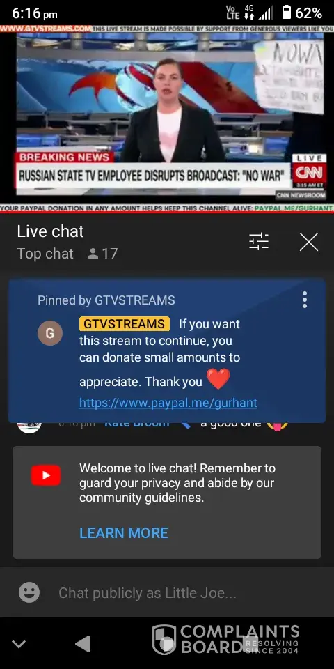 Everything YouTube acts and removes the content for breaching Warner Bros copyright another stream pops up, this content provides not only CNN live streaming but links to PayPal and Twitch as YouTube doesn't monetize this channel!