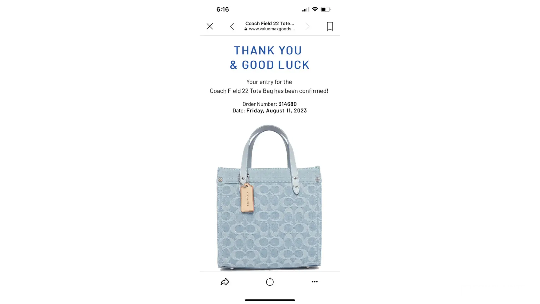 On Saturday July 1,2023 I entered a sweepstakes for a coach bag. This is not something that I’ve never entertained before. Against my better judgement I entered and I was told that I had won a coach bag. I was given a order ID # [protected]. And I was told I only needed to pay for shipping of $5.95. My bag would be shipped out in 2-3 days. I was told that all I needed to do was pay the shipping and sit back and wait for my bag to be delivered. I’m still not sure that this was not a scam but the $5.95 I paid was wirth the risk to recieve one if your bags. If you can give me some clarity I would greatly appreciate it.