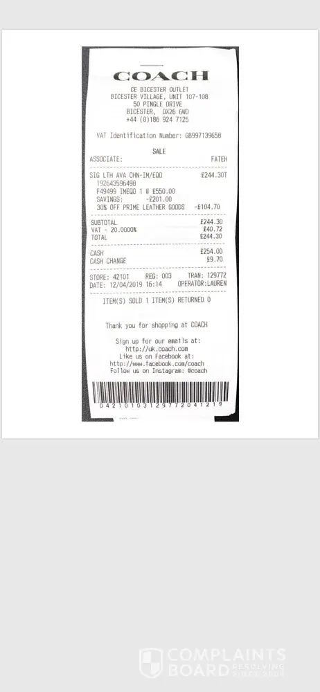 I am writing to complaint about a faulty bag that I purchased from a coach outlet in London in April this very year.