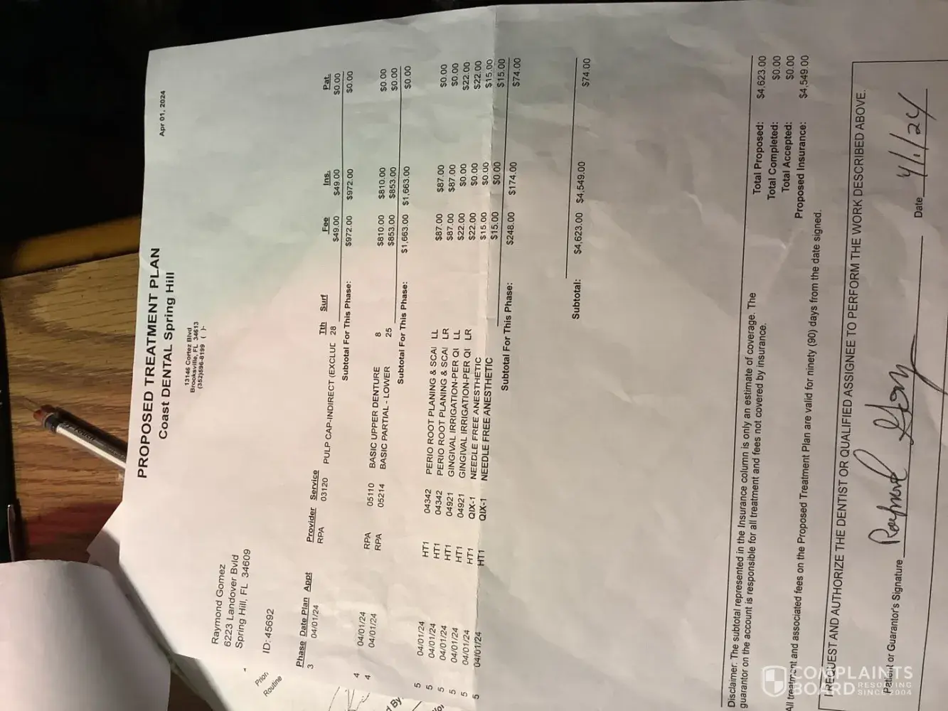On 8/22/2023, I went to Coast Dental Service (located at 5348 Bruce B Downs Blvd, Wesley Chapel, FL 33544 Tel: [protected]) with an appointment for annual cleaning. They said the machine for cleaning is broken that day and they took my X-Ray. X-Ray and normal cleaning is covered under my Cigna Dental Plan. After the X-Ray, they are telling me that they can not perform a normal cleaning and they can only perform a deep cleaning and provided a written estimate of $2257.99 for now and 3-monthly cleaning of $658.02. Additionally, they gave me an estimate for $7984 for other services such as Caps. I requested to perform the normal cleaning for which I took appointment and covered under insurance plan. They refused saying that their license is at stake if they perform regular cleaning instead of deep cleaning. I asked them to put that in writing and they asked me to leave and threatened to escort me out of the office. I believe a serious investigation should be conducted on the practice of this office and how they are forcing patients to pay much higher by refusing basic services. Just so you know, I have been doing basic services for the last 7 years in NJ before moving here in FL.