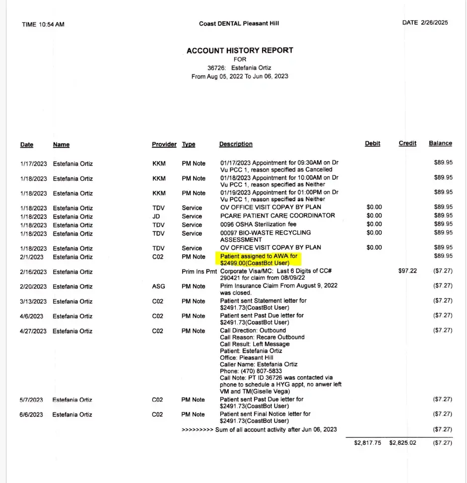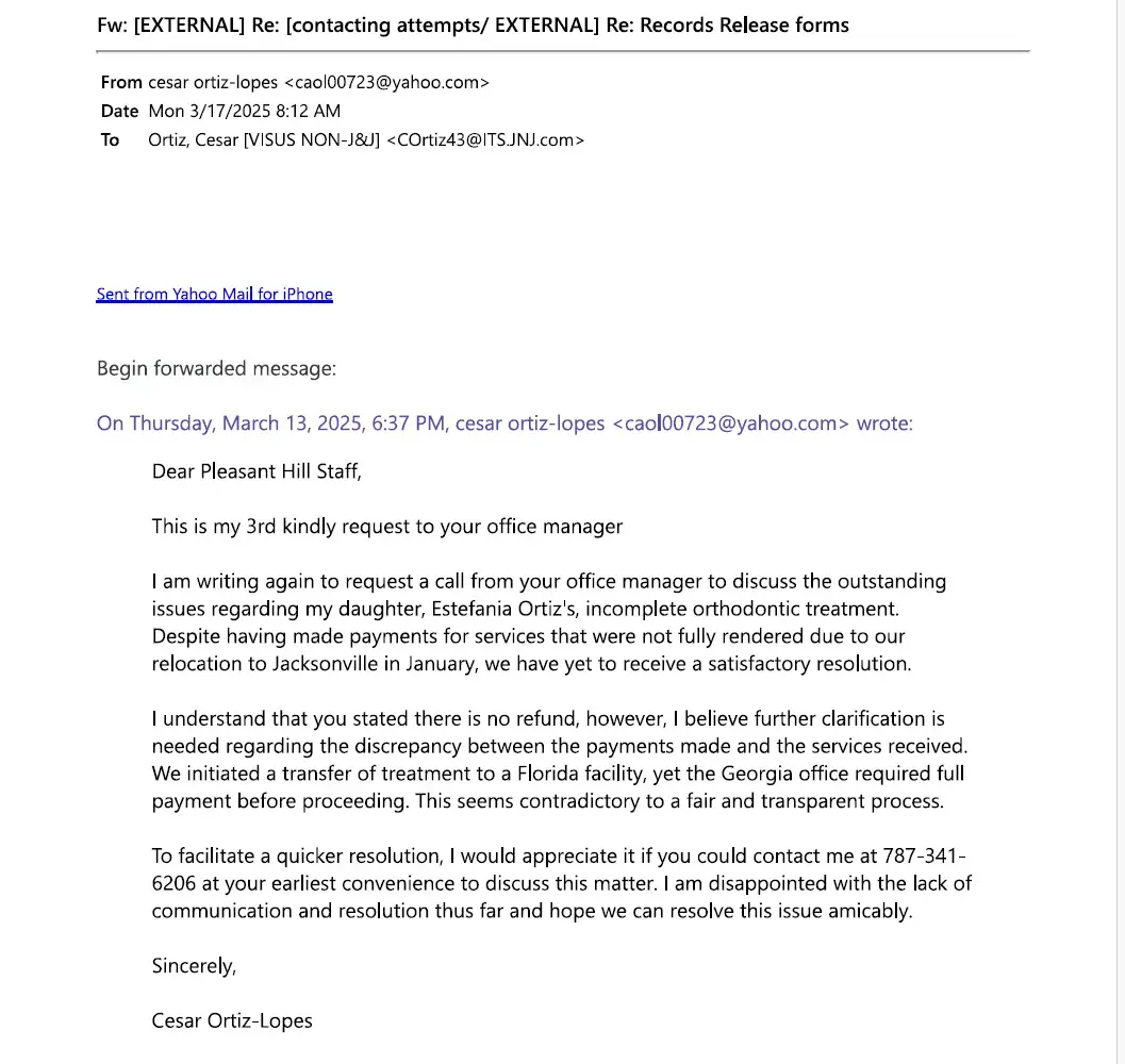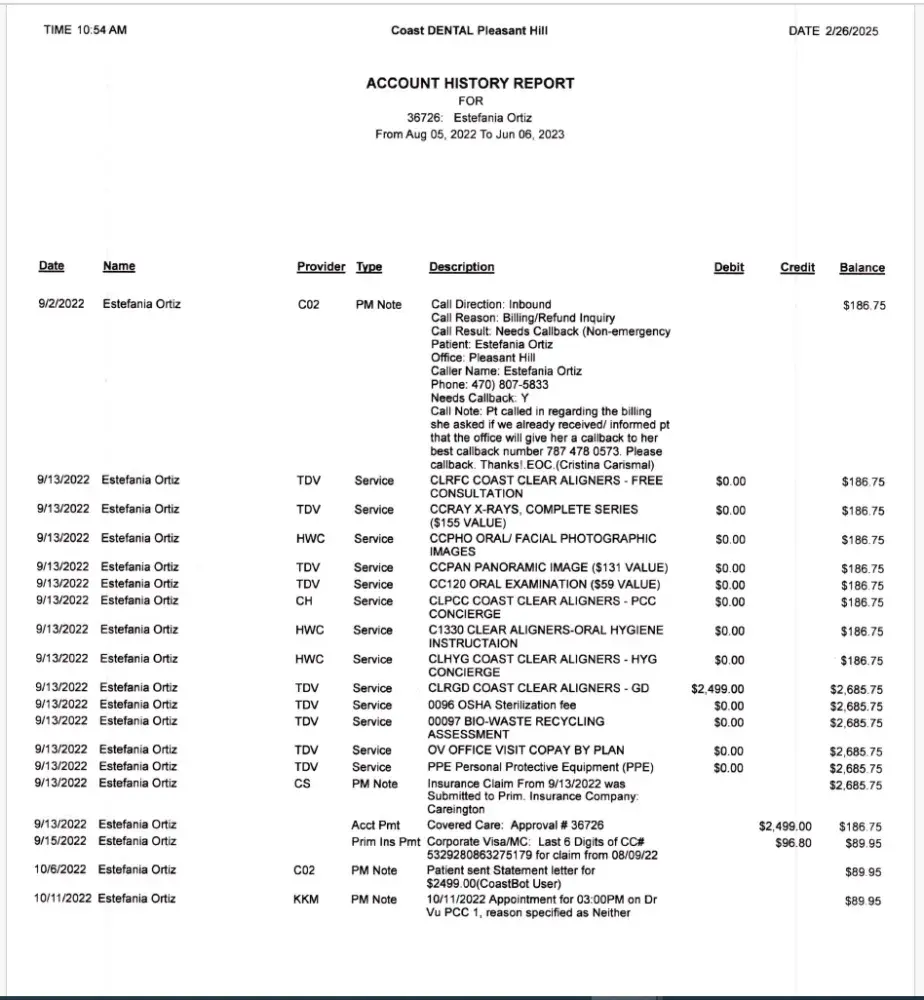 Trying to solve an issue regarding Invisalign treatment started at Pleasant Hill Facility in GA for my daughter in Jun22. We moved to Jax and requested a transfer, however instructions were to Be Paid for the treatment to continue. We got a bill for $2499 on Jun23. After 2 years of Monthly payments ($89) charged to my bank account, we contacted the facility...