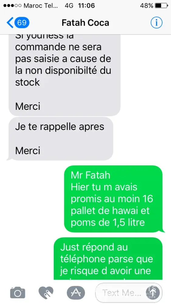 Hello sir, I'm new client of Coca Cola and I have a problem with area manager of Casablanca mororoco, he promesse to get me last weak 24 palets of hawai and poms 1, 5 litre with a discount of 5 Dh . But today he's not even answering my calls