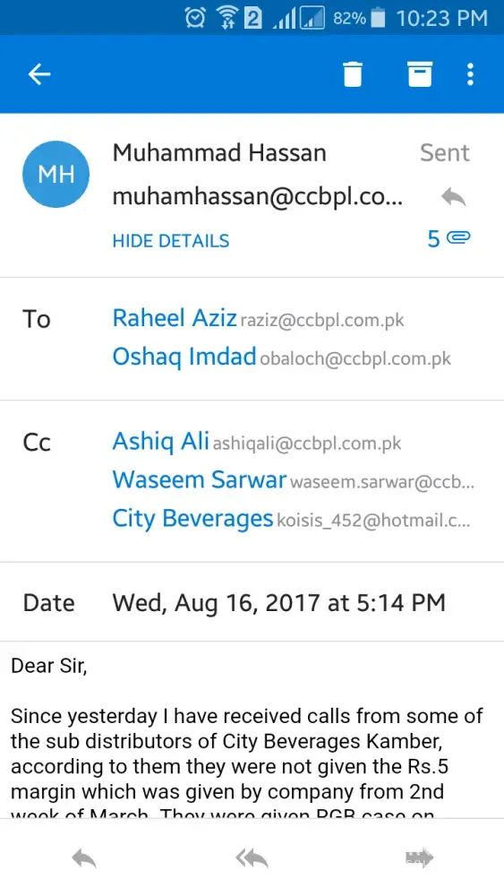 My name is Zulfiqar. I am working in Pakistan, Peshawar (Coca Cola Icecek). I want to notify to the company the poor policy of distribution that is going on in Pakistan and in our local market. The cross infiltration of SKU's from all across pakistan via wholesale distribution has crossed 50 percent of the total sale. The situation causes frequent departures of employees from the company and has made distribution network of Coca Cola very weak from the inside.