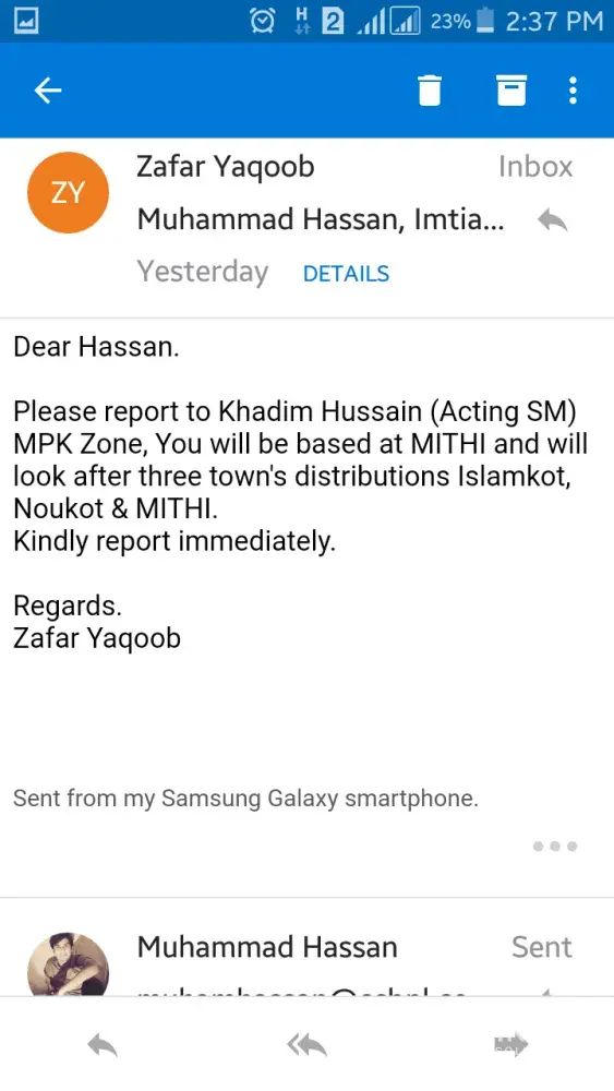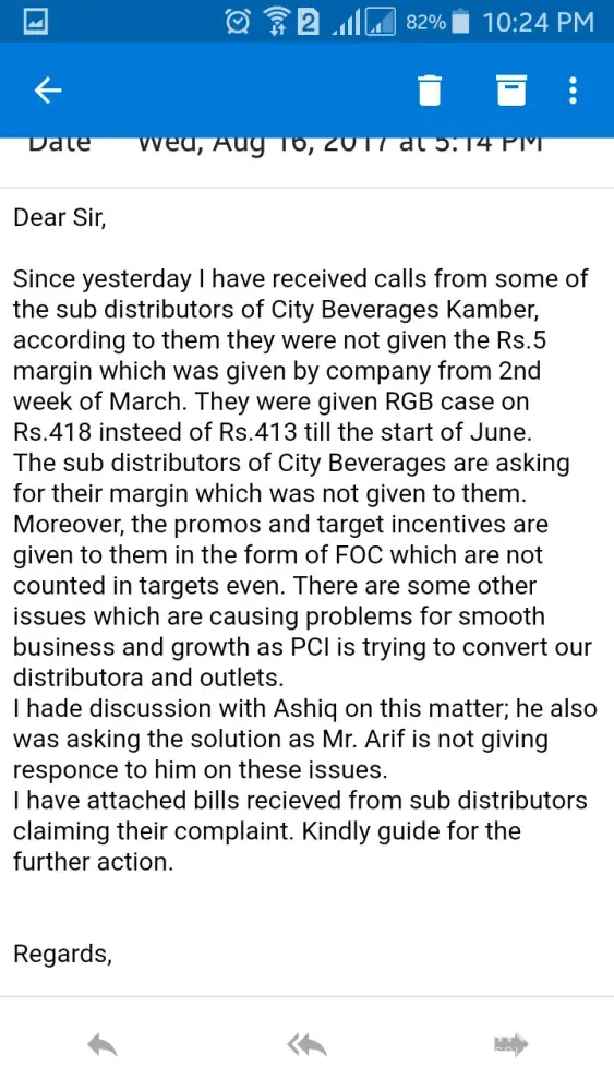 On 15th August 2017, my Sales Manager went on leave handing me over the authority of Acting Sales Manager. I got chance to report bad practices by distributors whice are harmful for the name and policies of our company. I collected the data against a distributor who is highly involve in illigal practice and creating the monopoly in his area. On August 16th, I sent a mail to my RSM and SM, consisting the complete data and proves.