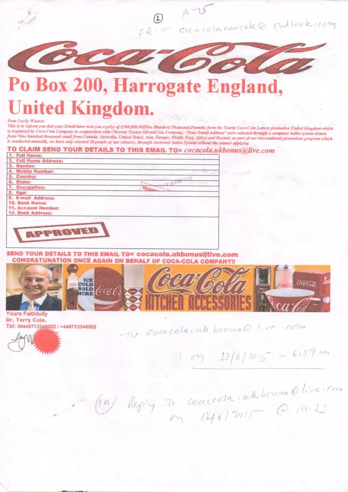 Sir, I received Emails dated. 12nd.June, 2015 & 16th.June, 2015 from A-15 - [protected]@outlook.com & cocacola.[protected]@live.com as I won the prize, please let me know whether the mail is TRUE or False and really I won the prize because unknown persons calling me to deposit the payments for transfer of fund in my accounts, Name:Dr.TOM BROWN- DIPLOMAT Coca cola Co.UK in india Mob.Nos are+[protected]/+[protected] and RBI Manager Dr.KIRAN K.Mob.No.+[protected]. Please do needful.