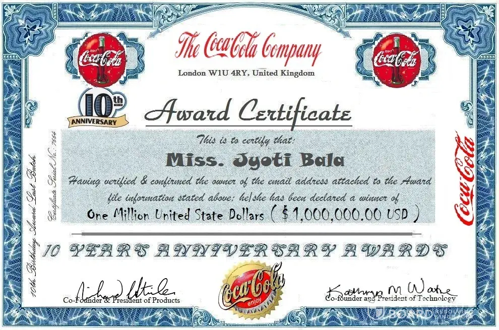 On behalf of the entire staff of the Organization, I wish to congratulate the Director and other non-Governmental organizations who have in no little way contributed immensely towards the success of this draw as well as taking concrete steps towards it's actualization. All participants were selected randomly from World Wide Web through computer draw system and Mobile Numbers were extracted from over 170, 287 Telecommunication Companies form Europe, America, Asia, Africa e.t.c, and 454, 980, 476 Websites. This promotion is part of the financial empowerment programme of COCA-COLA in it's struggle to alleviate poverty.