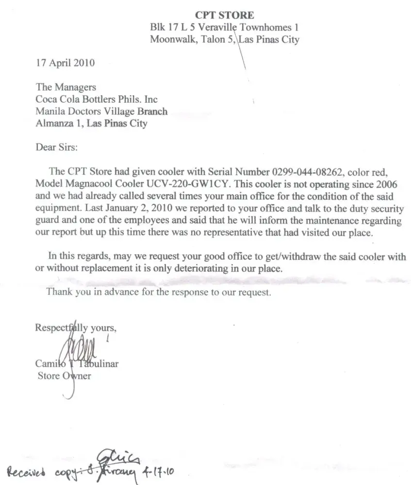 Forwarding the letter request from one of the customer of Centerpost Dealer, authorized dealer of CCBPI products in Las Pinas City.. Pls kindly make a quick response for this matter thanks!