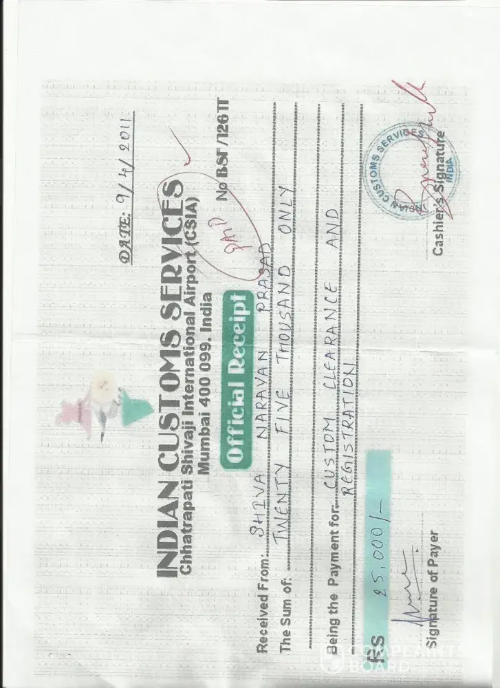 (1) rs 25, 000 for customs registration and clearance certificate (2) rs 1, 30, 000 foranti drug and money laundering clearance (3) rs 5, 80, 000 for currancy conversion in rbi (4) rs 1, 30, 000 extra due to delay in clearance.