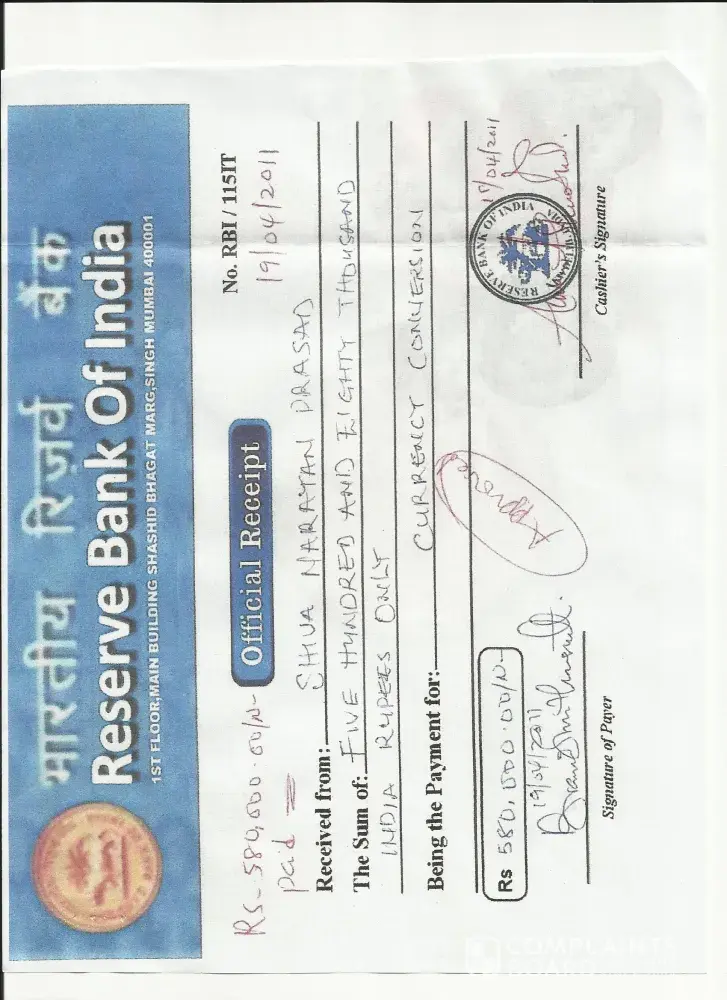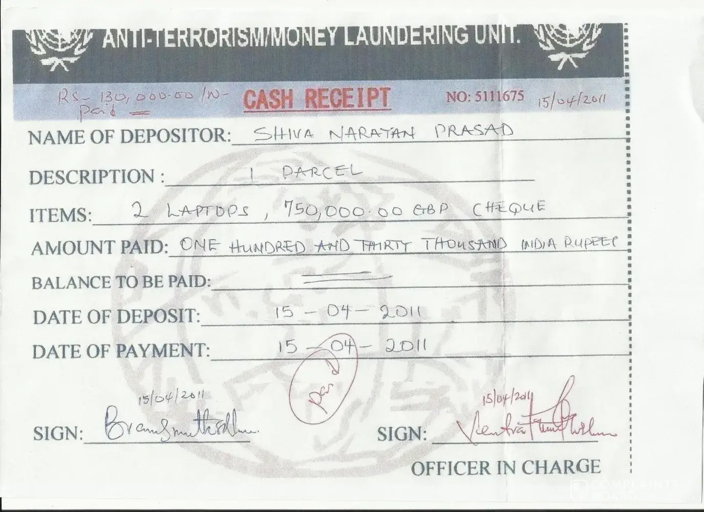 (2)Rs 1, 30, 000 for Anti Drug/Money Laundering Clearance from UNO, (3)Rs 5, 80, 000 for Currecy Conversion of 7, 50, 000GBP to INR RBI.All these amout was deposited through the diplomat Mr Brain Smith and it was given to him by Balance Transfer to the account of diffrent persons as directed by the diplomat Mr. Brain Smith.The scan copy of ( reciept of these
