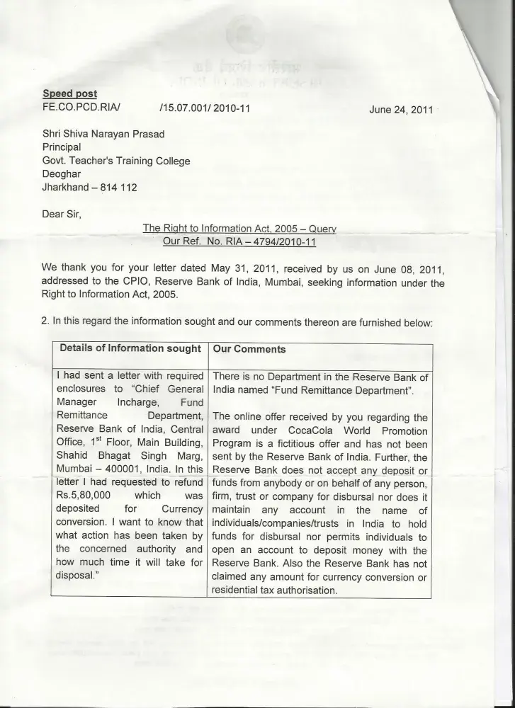 In the meanwhile I get informations under RIGHT TO INFORMATION ACT 20005 (INDIA) from Reserve Bank of India that the lottery Coca Cola World Promotion Program is fictious and false.Then I come to know that these type of lotteries winning payment centre UKIB etc. are fictious and false and thus the infomations sent by you and other releted orgnisations are false.
