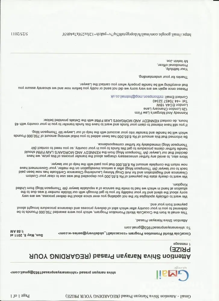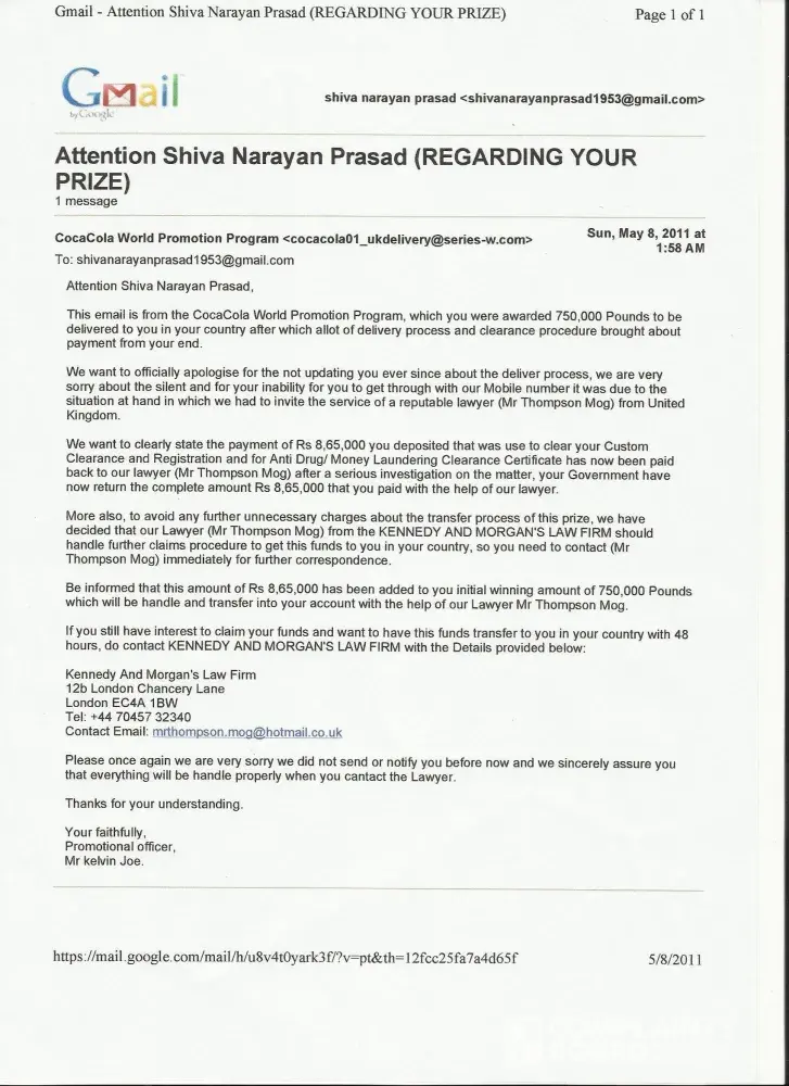 I had complaint that I was cheated behind the name of lottery named CocaCola World Promotion Program.In this connection, your answer is persent on this screen.Again I want to say that a diplomat named Mr. Brain Smith came to Mumbai (INDIA) and showing fake reciept of Custom Dept., UNO, RBIetc. cheated Rs 8, 65, 000. Wining Payment Centre, UKIB, etc informed me that I was the bonafide winner of the prize.I was directed to contact to Kennedy And Morgan's Law Firm and also infomed that the money Rs 8, 65, 000 expended by me was added in this prize. I did so. The Law Firms directed me to deposited again Rs 1, 90, 000 to get this prize.