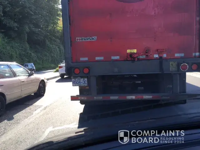 This morning I was heading Eastbound on S/E Marine Drive in Burnaby. I have been making this commute for months. Lots of construction, lots of congestion. Today construction had closed the 2 rightmost lanes, for about 2 blocks. We were all merging alternately as you are supposed to to keep the flow of traffic moving. The Coke truck aggressively forced his way up the centre lane, blocking any merging. I DRIVE A TINY FIAT 500. He forces beside me, not only making me move more right- but entirely stops me from moving forward- he also passes the car in front of me who has no more road in front of him! He then stops his truck and starts mouthing off, with his mouth is full of some food he is cramming in there, pointing for us to get behind his gigantic transport truck. His license plate is 8504 3C BC plates. He was a white man, balding, red faced and angry looking. Absolutely no reason for him to cut us off, neither me nor the van in front of me had passed him earlier - he was behind us the whole way. He turned left up Boundary Road. I am reporting this because this was dangerous driving at it's worst- a, 18 wheeler in rush-hour against a Fait 500. Can't we all just be a bit kinder to each other?