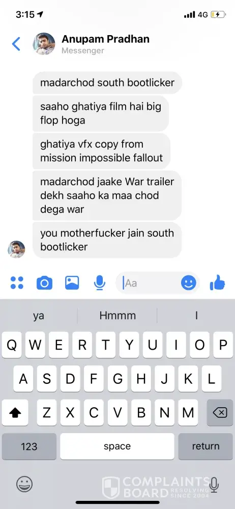 The employee from cognizant his name Anupam pradhan he works as application development analyst in cognizant, manyata embassy tech park, as been using foul language, violating communal peace, and sending me vulgar words talking about about south India, please look through the matter people like this is very dangerous I attached the screenshot of his messages for me through Facebook,