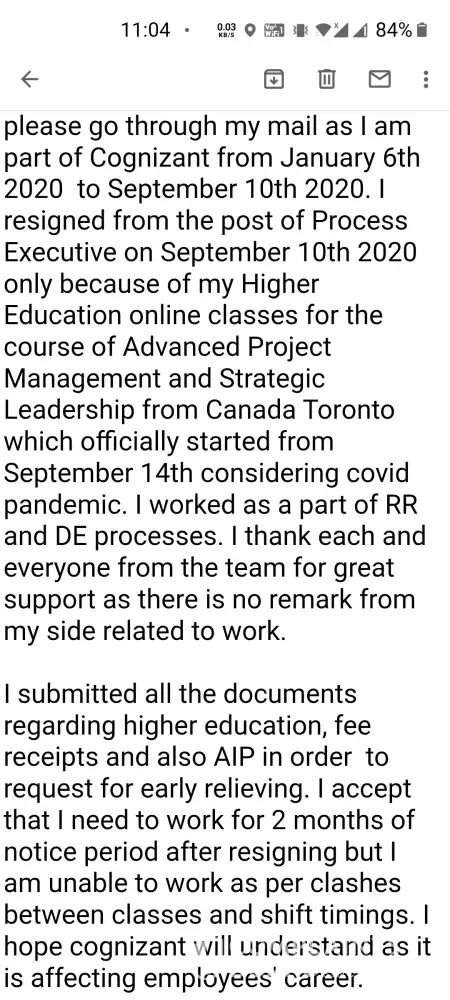 Hello this is regarding the great cognizant technology services which is hiring people just to treat them as slaves. I had many dreams while joining into company... But yes all of my managers and leads played gud role including hr decided not to give early relieving. Cognizant dosent even trust employees problems... As u resigned genuinely for attending online classes for masters which were decided by college suddenly due to pandemic. I requested every day sending mails that I want early relieving but there is no response. All they need is to collect assets as I am working from home... Worst hr... Indirectly they are kicking me out of company without my permission... I request people not to join in such fraud companies and waste ur valuable time. If you join you will come out without proper relieving letter. They just suck your blood. I worked 8 months and regretting today. No one will actually take action that is the fact.