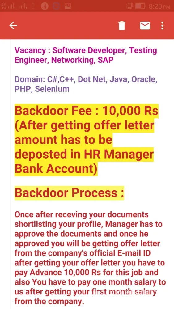 I am dhanya.I got a call from one Mr.Hari, he said he is a cognizant hr in ramanujam IT park in chennai.He said about the backdoor process to enter into cognizant.about the process he said me that no interview after getting offer letter from company website I have to pay 10000, after joining I have to give my first month salary to manager account.he cheated me.talked with me like a genuine person.I trusted him blindly.I got offer letter he said to transfer amount I did.the next day i opened mail, my offer letter canceled like that it came.I was shocked and trying to contact him.he switched off his mobile.I am from poor family I have all details of his bank account