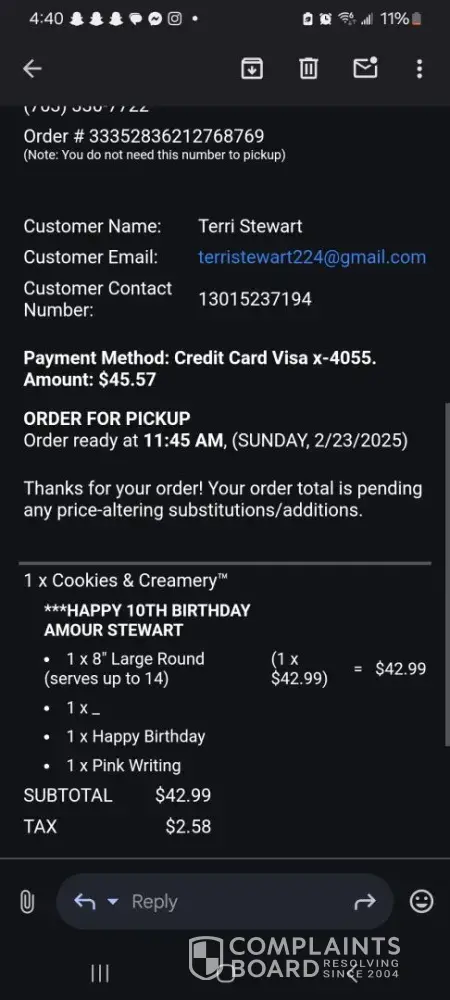 Dear Cold Stone Management, I am writing to formally express my disappointment regarding my recent experience with an order placed at your Manassas, VA location. On February 21, 2025, I ordered an Oreo ice cream cake for my daughter’s 10th birthday party, with a scheduled pickup on February 23, 2025. My family and I traveled an hour and a half to 8113...