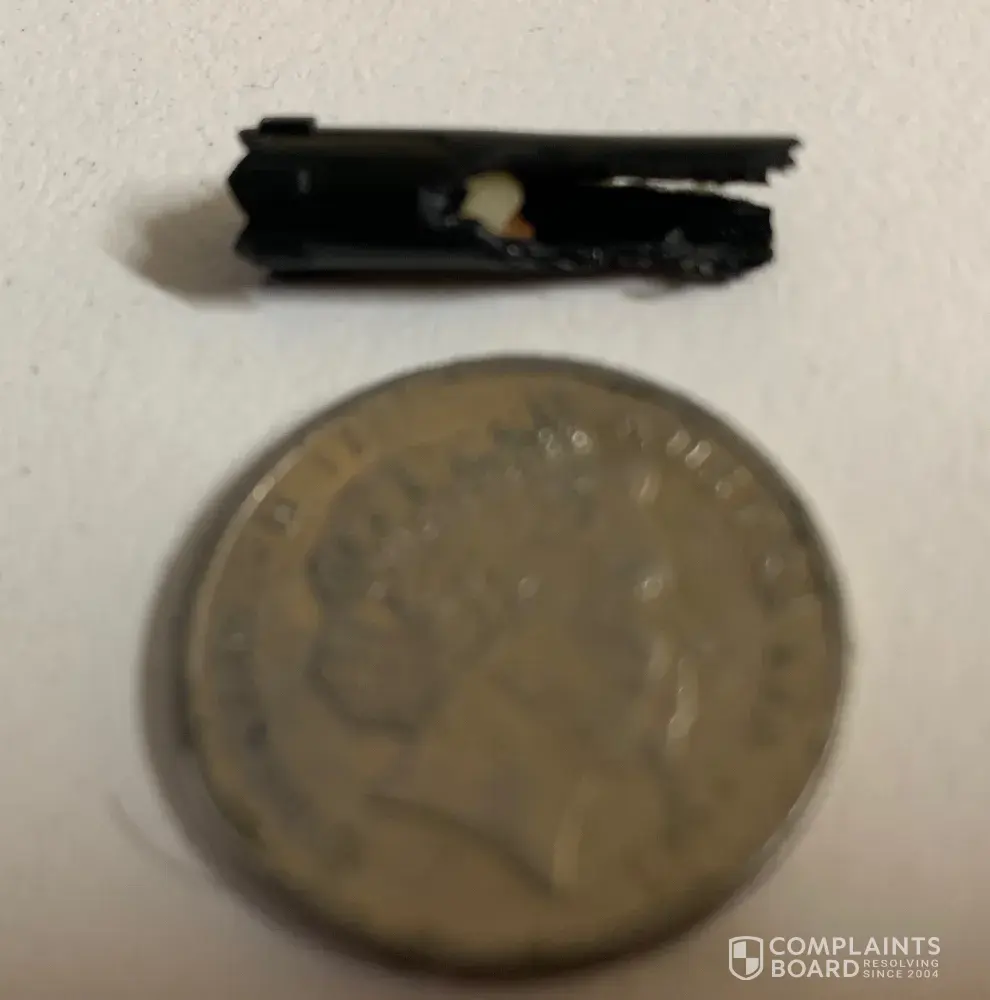 About half way through the packet and at approximately 9:45pm whilst operating a mining Haul Truck, I place a few almonds into my mouth and began chewing. I bit down and felt an heard a crunch and felt something sharp catch the back of my throat as I swallowed. As well as a pain to my top right rear moler. At the same time I had what I thought was part of an almond trapped between my clenched teeth from biting down. I reached into my mouth and removed a hard piece of cylindrical plastic with a section missing. Presumably the piece I believe I swallowed?