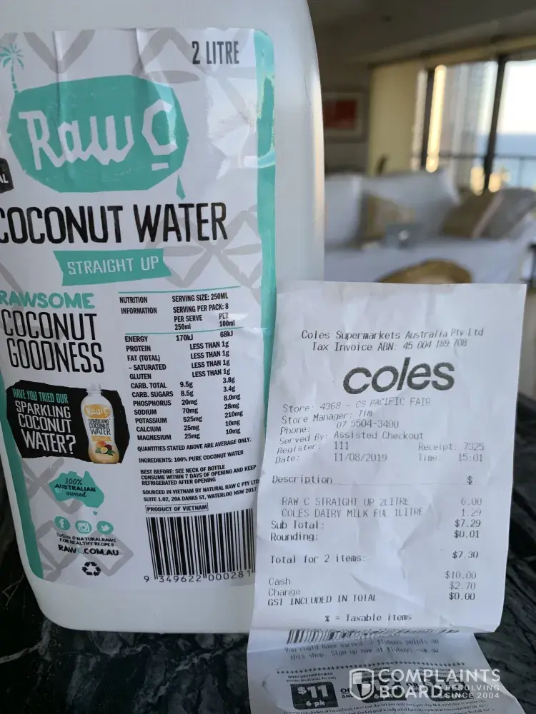 Today while visiting Coles at Pacific Fair, Broadbeach Qld, we saw a product Raw C Straight up 2 litre coconut water for $6.00. The bottle said it contained 100% PURE coconut water - Label says "sourced in Vietnam".
