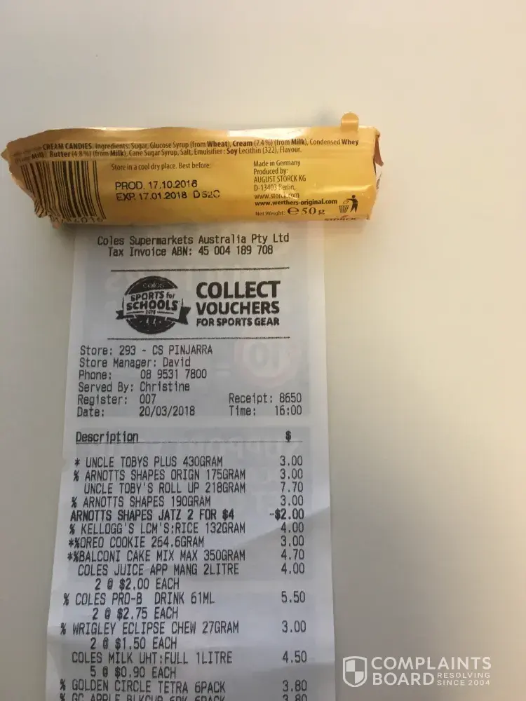 Went shopping at Pinjarra Coles and brought a pack of werthers original and they where out of date. My daughter started eating them and I had to stop because of the expiration date. I have sent photos for proof of purchase and to show you the werthers originals are clearly out of date. I will monitor my daughter for the next 24 hours incase she gets sick from the Werthers Originals. Thanks Steven.
