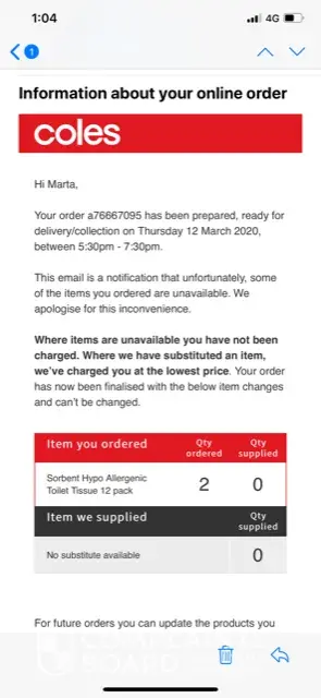 I received an email from Coles today advising they have not charged me for the toilet paper as they cannot supply it.