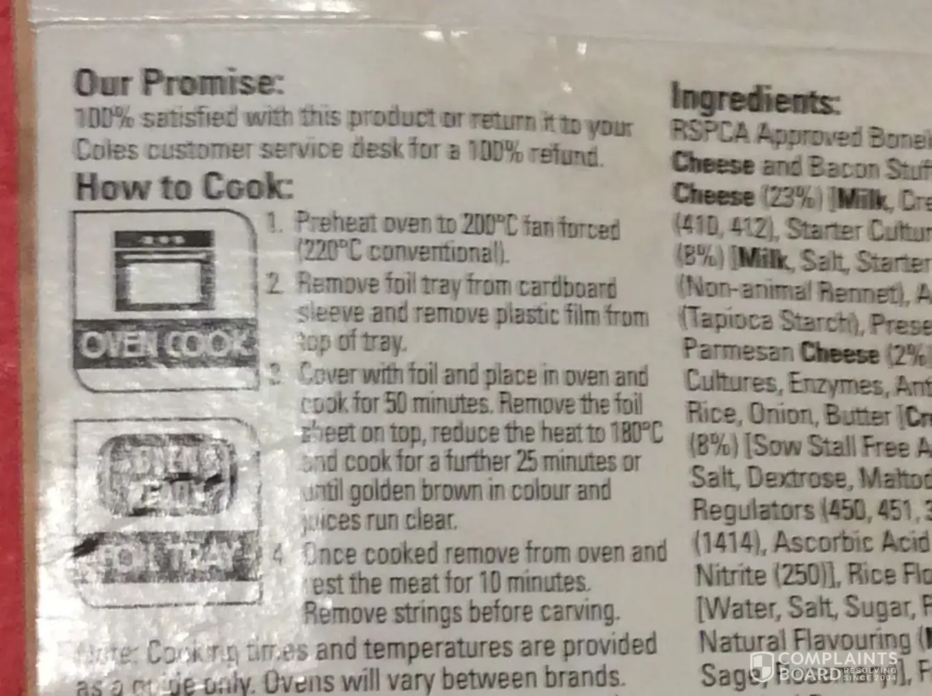 Hi Guys, I want you to know that I'm a loyal customer for Coles and have never had a complaint in the past about your produce. I'm 40 years old and live in Tasmania. I brought your boneless chicken with 3 cheeses and bacon stuffing costing $15 for a meal with my family of 4 from your store in eastlands in Hobart. We adheared closely to the instructions on the back of the packet on how to cook. Once we took it out of the oven and carved it up the cheese on the inside curdled and there seemed to be hard bits in the stuffing. Unfortunately we were unable to eat it. Can you please reimburse us for our loss.