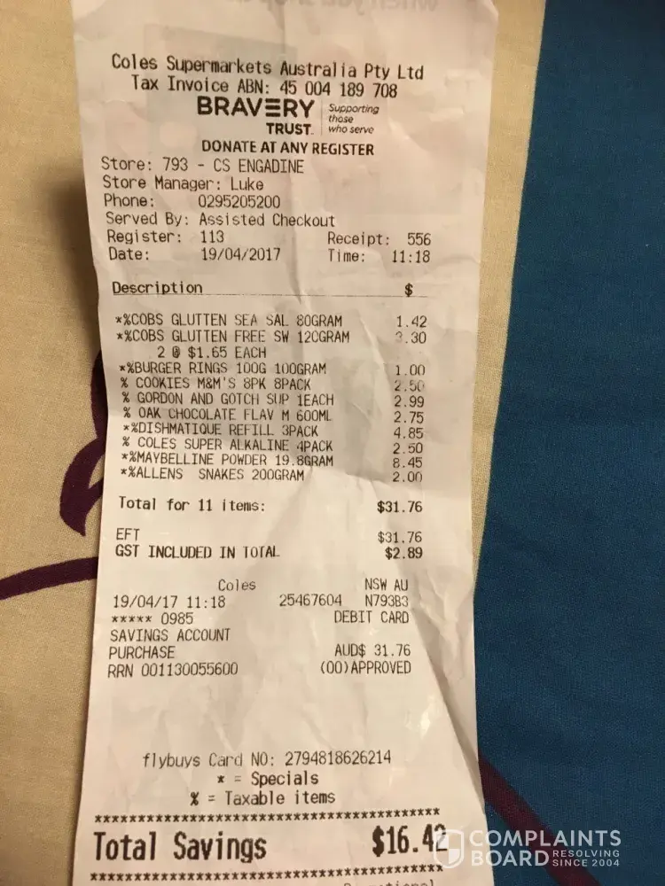 I went to Engadine coles to buy a few things on 19th April 2017. I accidently scanned a product twice as I was at the self service counter. The product was Cobs Glutten Free Popcorn. I call the attend and she took the product off. Walking to my car I noticed that it was still showing the product twice, so I walked back and spoke to the girl, as she advised that the minus does not show on the docket but she can show me on the machine that she did take off the product. I said ok, but that should show cause people would want to see it. She just said the new machines don't show it. I went home and added it all up and it did not add deduct the product, it still added onto the total. I doubled checked this. I phoned the store and spoke to Maree and I explained to her what had happened as above. She also confirmed that it does not show on the docket. I explained to her that it might not show on the docket but it does not deduct the item and still adds up to the total amount. Mind you, the amount is only $1.65 as the item was on special. I advised her of this amount over the phone, and her response was, "well for only $1.65 just come in and I will give you the refund. Excuse me! This was not the issue, the issue was that the amount deducted does not deduct from the total amount. She then continued to say to come in and bring the docket into the store as this will need to be explained to head office as they need to be told. How many people will be caught with this, thinking that it has been deducted when it hasn't, no everyone checks, well sorry to say I do, as at the moment I don't have a job and this is not the first time it has happened. Though this time I will do something about it. You know that the Engadine store is the worse store for customer service I have come across. I go there cause it's close to where I live, but with that attitude I would rather drive 20 mins to the next store. I really don't know how people get jobs with attitudes like that. "only a $1.65" honestly. The docket is attached below. I just wanted to go directly to head office with this as that is what Maree said she needed to do, but I really didn't believe her cause of her attitude. I do appreciate your time, but please accept my apologises if I am incorrect. thank you for your time in this matter