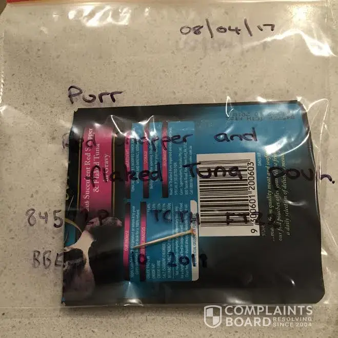 I saw the bone, that had pierced the roof of his poor little mouth. Our cat had a mouth perforation and thusly, we had to treat him with antibiotics afterwards. I have attached in the photos with this complaint, the size, date and package information. Please contact me as soon as possible; I am truly horrified that I have yet to hear any response. If I do not hear a response soon, I will take this to social media. I am appalled, our cat, whom we rescued and paid money to do so and have nurtured could have died that night, without me having surgical knowledge and my fiancee and I thinking quick. We only shop at Coles, but have deeply decided to take our business else where. Considering we have two cats, we have stopped buying purr altogether, since this horrendous and traumatic incident.