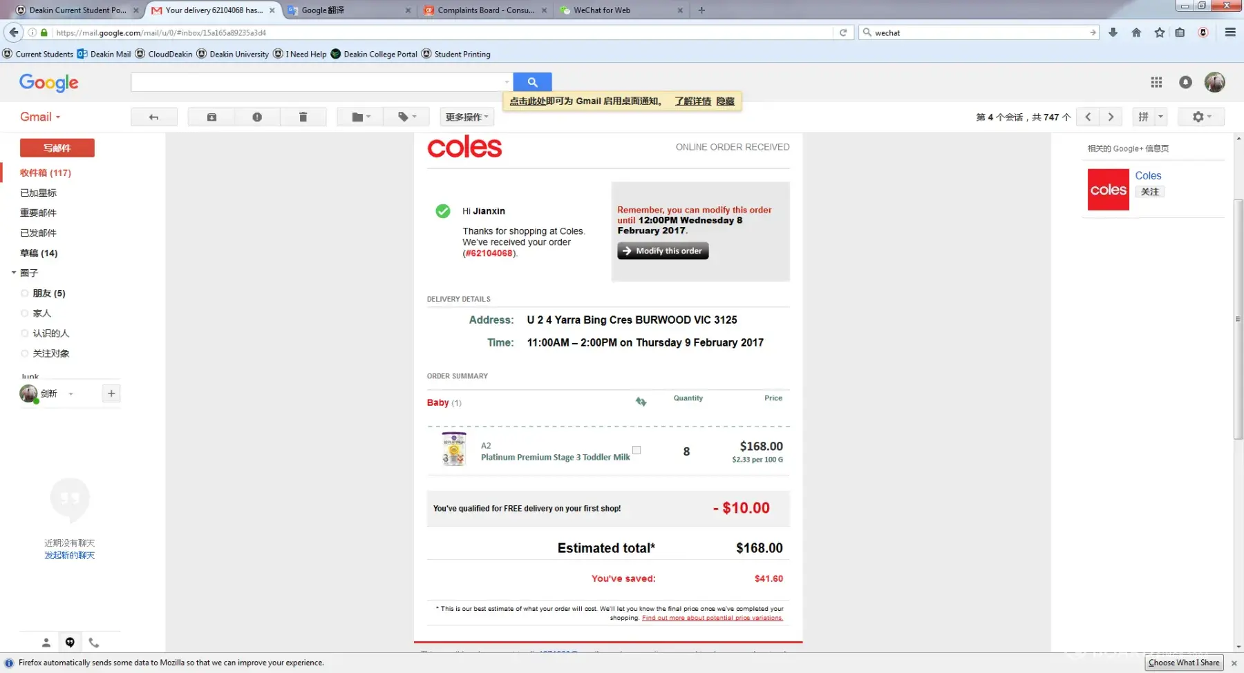 At 7 feb 2017, I had placed an order ([protected]) about the special price item on a2 step 3 baby milk powder which was $20.99, and I had selected a delivery date on 10am to 2 pm, on 9 feb 2017. This evening I had received the confirm email and it told me that the goods will be delivered between 12:30 pm to 1:30 pm. I am so happy and ready to receive my ordered items. But there was another email told me that the order [protected] was canceled. The reason is the product was out of stock! Excuse me? I had seen many cans of a2 step 3 on the coles shelf this afternoon and your staff jeremy told me it was out of stock? Next time I will take phone as evidence, the item was $20.99 and now it is $26.20, so that your staff tell me it was out of stock so that we can not deliver to you? When I shopped online on 7 feb 2017 the website said that I can only buy 8 cans and it had stock, however, tomorrow will deliver to me and tonight it had been canceled!