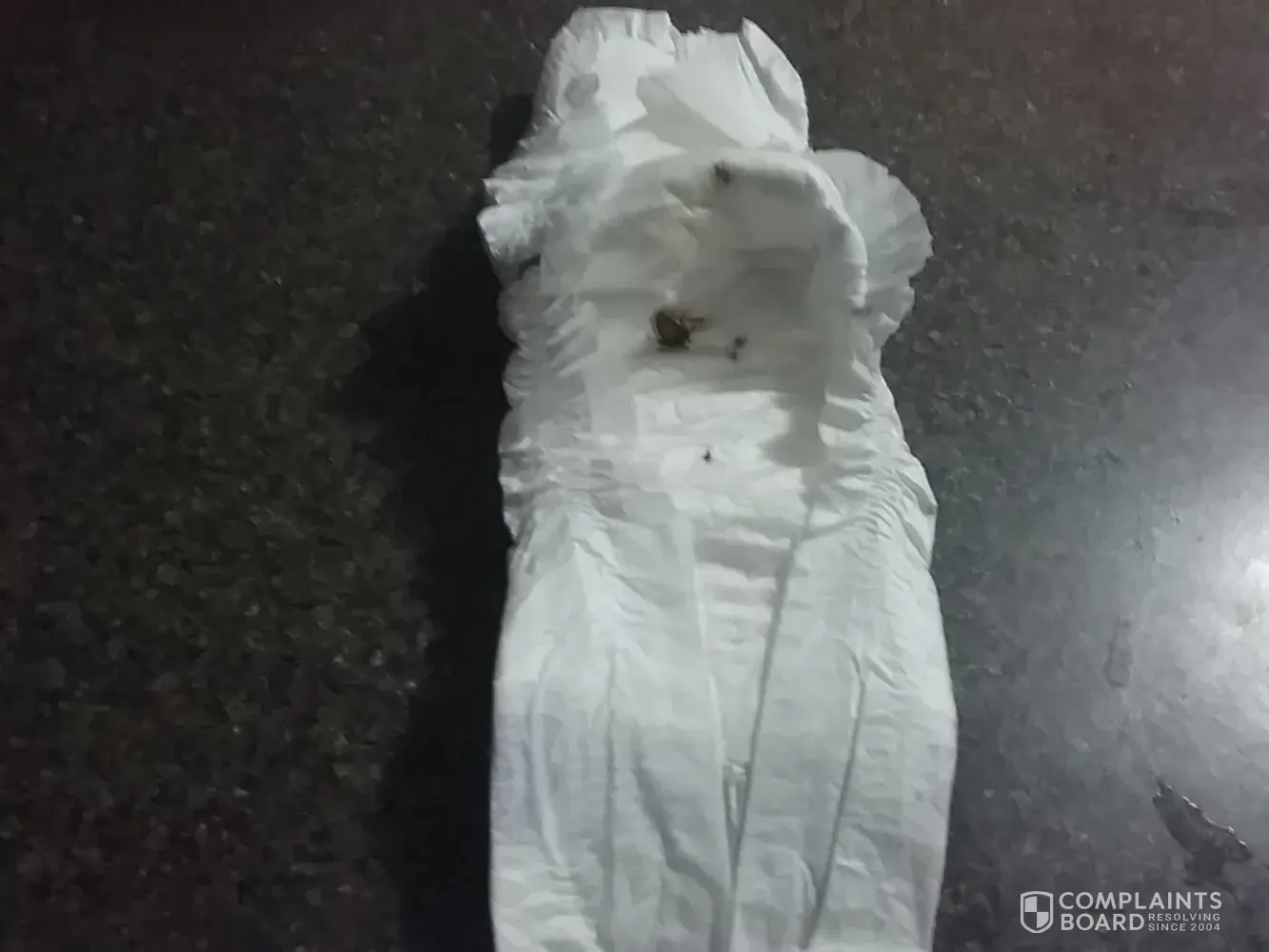 Opened the bag when getting home, needing to change my 2 year old, opened the nappy up and there was a dead cockroach inside the nappy.