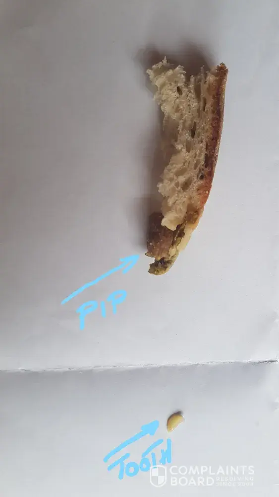 Today at 12:30 pm WST I was having a soup and some stone baked batard. This bread I bought at Coles shop in Kardinya two days prior. On eating a slice of this bread, unknowingly, I bit into green olive pip, resulting in a loss of crown section of my molar tooth on a right hand side and sharp pain. Photos attached. I am currently on break and away from my...