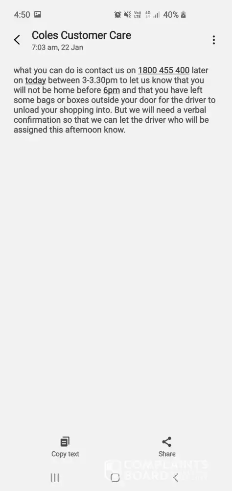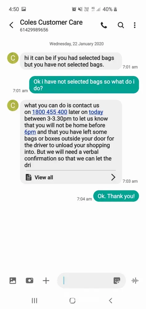 This morning i text my local Coles. I received an email stating when my delivery will be coming between 4 & 5pm. My chosen time was between 4 and 10pm. I stated that i would not be home until 6pm could it be left at my door. They said it can only be left if i had bags. I messaged saying I didn't order bags with my order so what can i do. The replied to leave bags or boxes at the front door then to call thos arvo because if i verbally told them they could get the delivery driver to put the groceries into the bags. This is now not being done, i have been told i will be charged a $30 cancellation fee. Im not happy about this at all and will take this further if im not given a full refund. The store it was packed wont help me, the delivery driver won't help me and the young man i spoke to was not willing to help me. I asked to speak to a manager twice and was refused until the third time i asked and im still waiting for a call back. If I had of been given the right information this morning in the first place this would not habe escalated into this issue. Id like a phone call and refund about this issue.