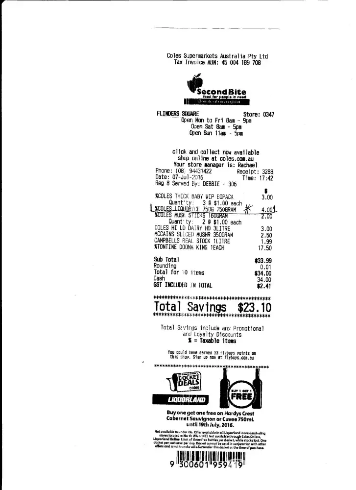 Bar code: [protected] @ $4.00 (please see attached coles receipt for this licorice mix).