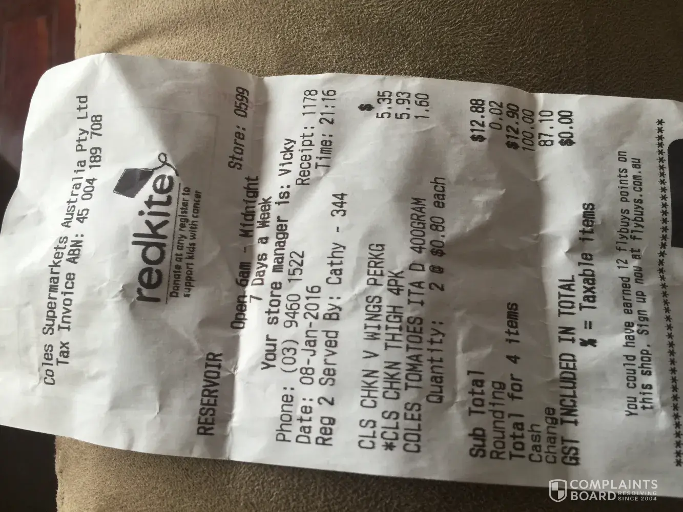 i have complained on numerous occasions to coles 4496 and even to the head office in brisbane. about sour milk in there parmalat iced coffee range, salami going off the next day after it was bought in there deli, eggs that always seem to have one to two stuck to the egg carton coles brand, coles brand frozen pies that the bases fall to bits when heated up in the oven, fruit and vegies that last two days in the fridge then go off.i have complained to coles on facebook to shame them into correcting these issues.but was met with the sarcasm i am used to of lower management in coles stores. i have even threatened to stop shopping there and actualy followed through with this threat.my wife stupedly sent a friend into this store to get some shopping where he got a chicken bar code number, [protected] receipt no.9417 dated today the tenth of october, through register 3 kerry 339.time 17:52 store 4496.now my wife was a manager of a chicken delicatessen called the chicken deli, lucky she had been as she always checks the meat inside the chicken to make sure it is cooked.the coles family chicken $10 special she bought was half raw, so word of warning coles.i cant control if my wife and child buy something from coles on impulse, but!if one of them gets ill through colese lack of interest in fixing these many issues i will sue coles for every cent i can get out of them.
