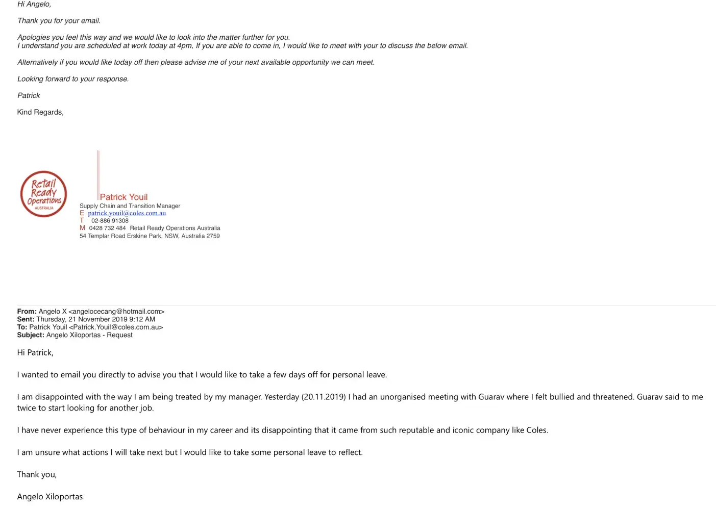 Hi, My name is Angelo and I've had the privilege to be part of the Coles (RROA) family for a brief four months. I recently was terminated as shift manager at RROA (Erskine Park) for my performance. Which was one of the most disappointing days in my career. I have an attached an email to explain my experience with my direct manger who looked through a...