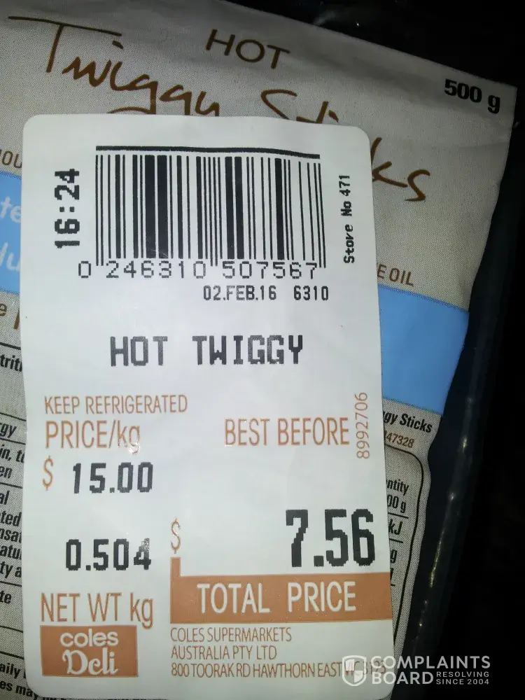 On 02/02/16 store 0471 at 16:24 I bought 500gm prepackage Twiggy Sticks: Half price $15 a Kg. But when you pick up the 500gm prepack twiggy sticks it gets weighed and you are charged for the packet. STILL waiting for Coles to respond. Does Coles weigh tin food or chocolate bars, breakfast food and charge as weight they find on their scales.